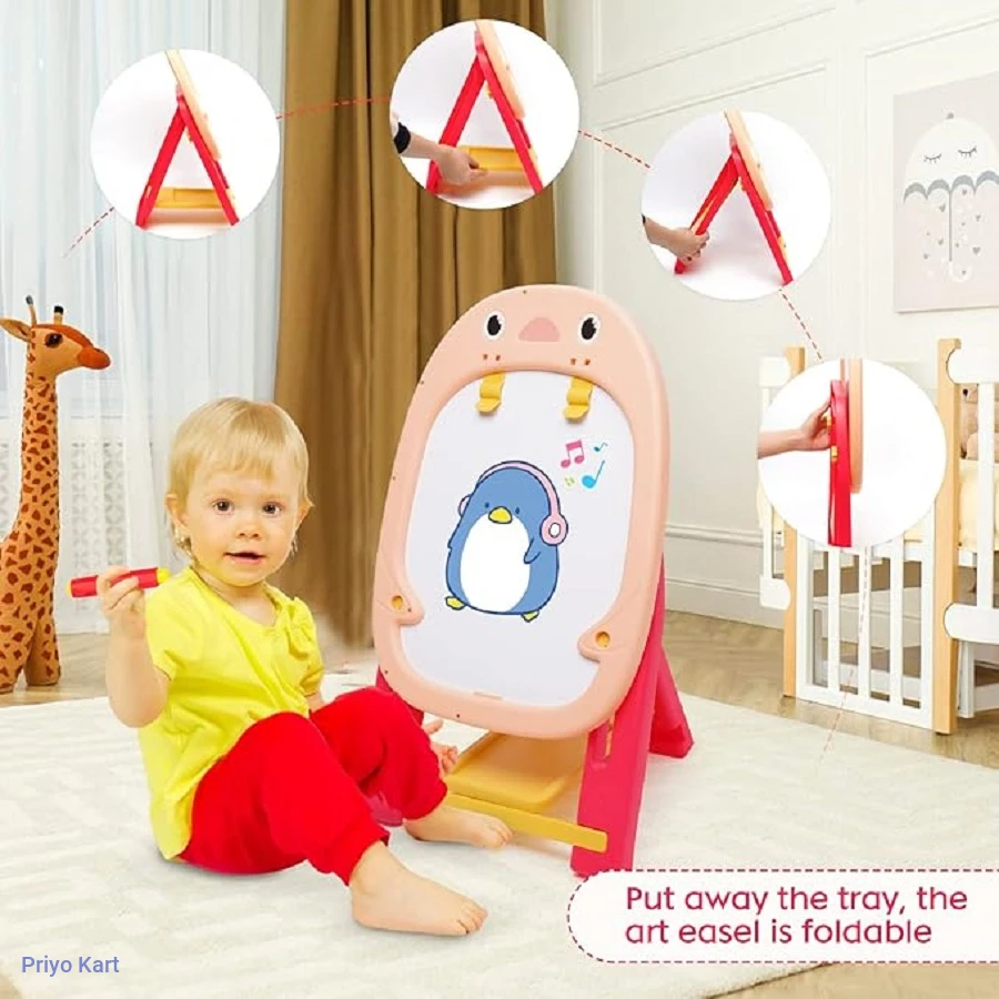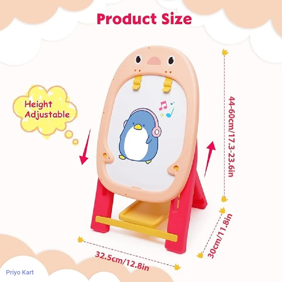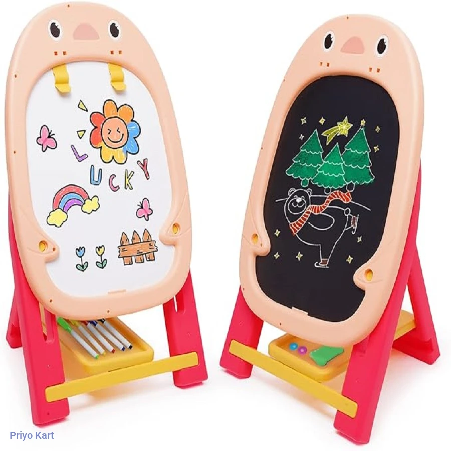 • [Double Sided Kids Easel] : The drawing board is made of ABS quality material. Children's art easel includes two surfaces, one side is a blackboard, and the other side is a magnetic dry erase whiteboard. Two surfaces allow two or more children to play. Your little artist will love creating new masterpieces on this standing art easel.