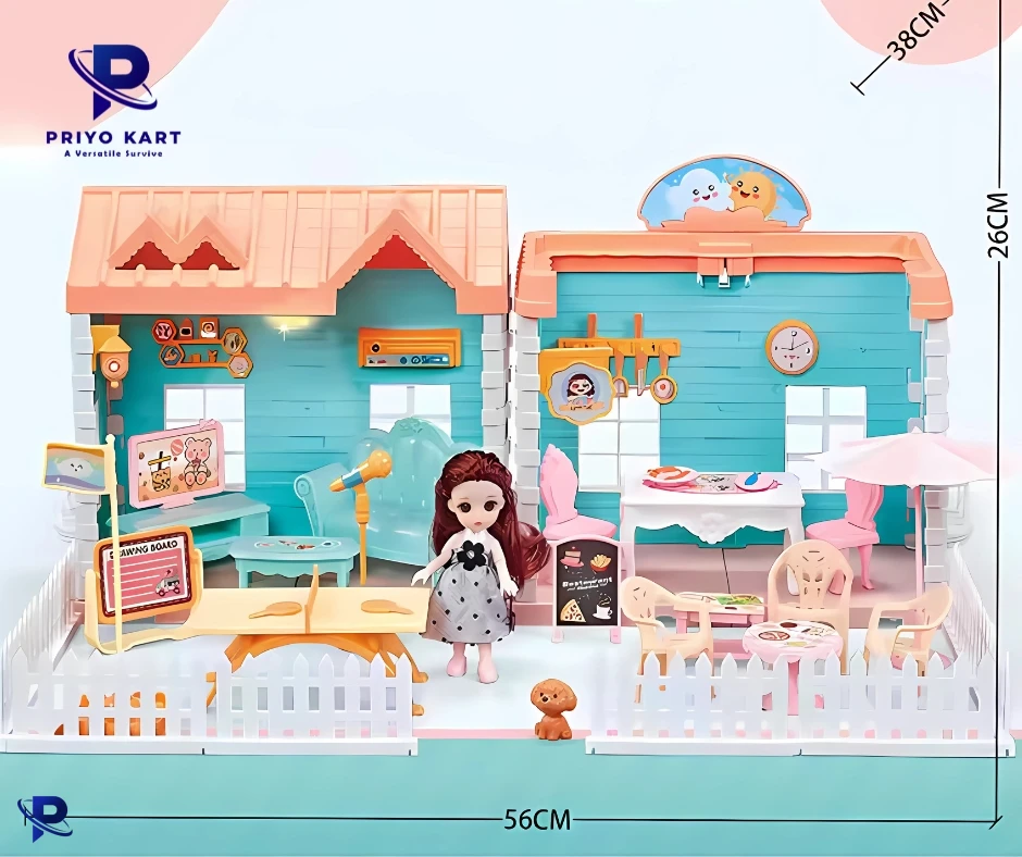 spiral staircase, 20+ furniture accessories, 2 play dolls and 2 pet dogs. The