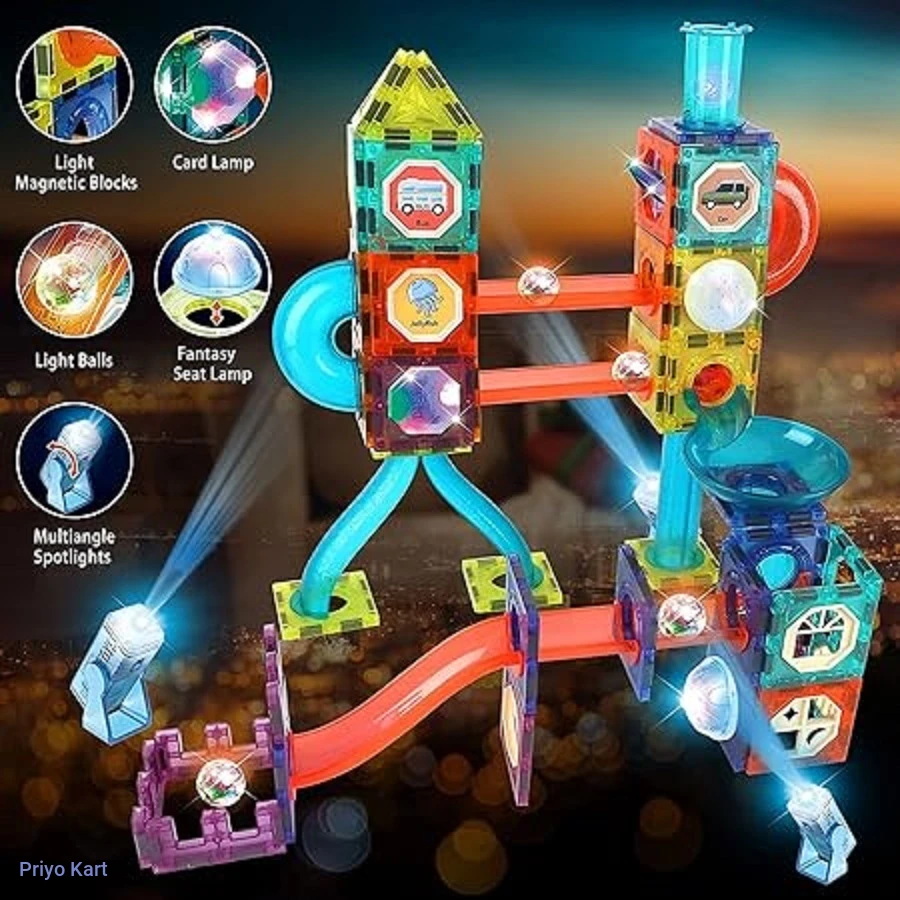 pipelines, colorful balls, lighted balls, magnetic blocks, some funny stickers of